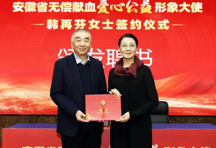12月14日,安徽省血液中心举行无偿献血爱心公益形象大使聘任仪式。安徽省卫生健康委员会正式聘请国家一级演员、安徽再芬黄梅艺术剧院院长韩再芬担任“安徽省无偿献血爱心公益形象大使”。韩再芬曾两次荣获中国戏剧“梅花奖”,并获得“文华表演奖”“白玉兰戏剧奖”及全国“德艺双馨艺术家”称号。